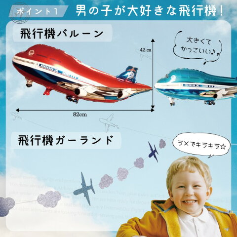 ・飾るだけ!オールインワンパッケージ ・雲みたいなバルーンガーランドが作れる! ・40センチの数字バルーン1〜3付き かっこいい飛行機バルーン!・つい抱きつきたくなるビッグサイズの飛行機バルーン。