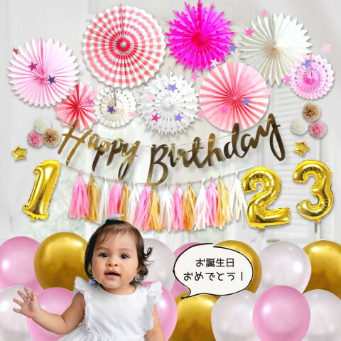 ◇52点セット◇ ・Happy Birthdayガーランド(ゴールド)×1 ・スターガーランド(ピンク)×1 ・ペーパーファン×9種類(ピンク、ホワイト) ・タッセル×15(ピンク、ホワイト、モカ×各5) ・ペーパーフラワー×6(ピンク、ホワイト、モカ×各2) ・スターバルーン(ゴールド)×2 ・バルーン×15(ピンク、ホワイト、ゴールド×各5) ・数字バルーン40cm『1』『2』『3』(ゴールド)×各1 【ペーパーファンの柄の組合せについて】 ペーパーファンの組合せは2パターンございます。